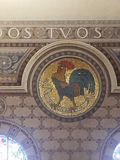 The mosaic cockerel, very pretty and shiny, renovated thanks to Stéphane Berne's Heritage Lottery, great presenter of television programs about History.
