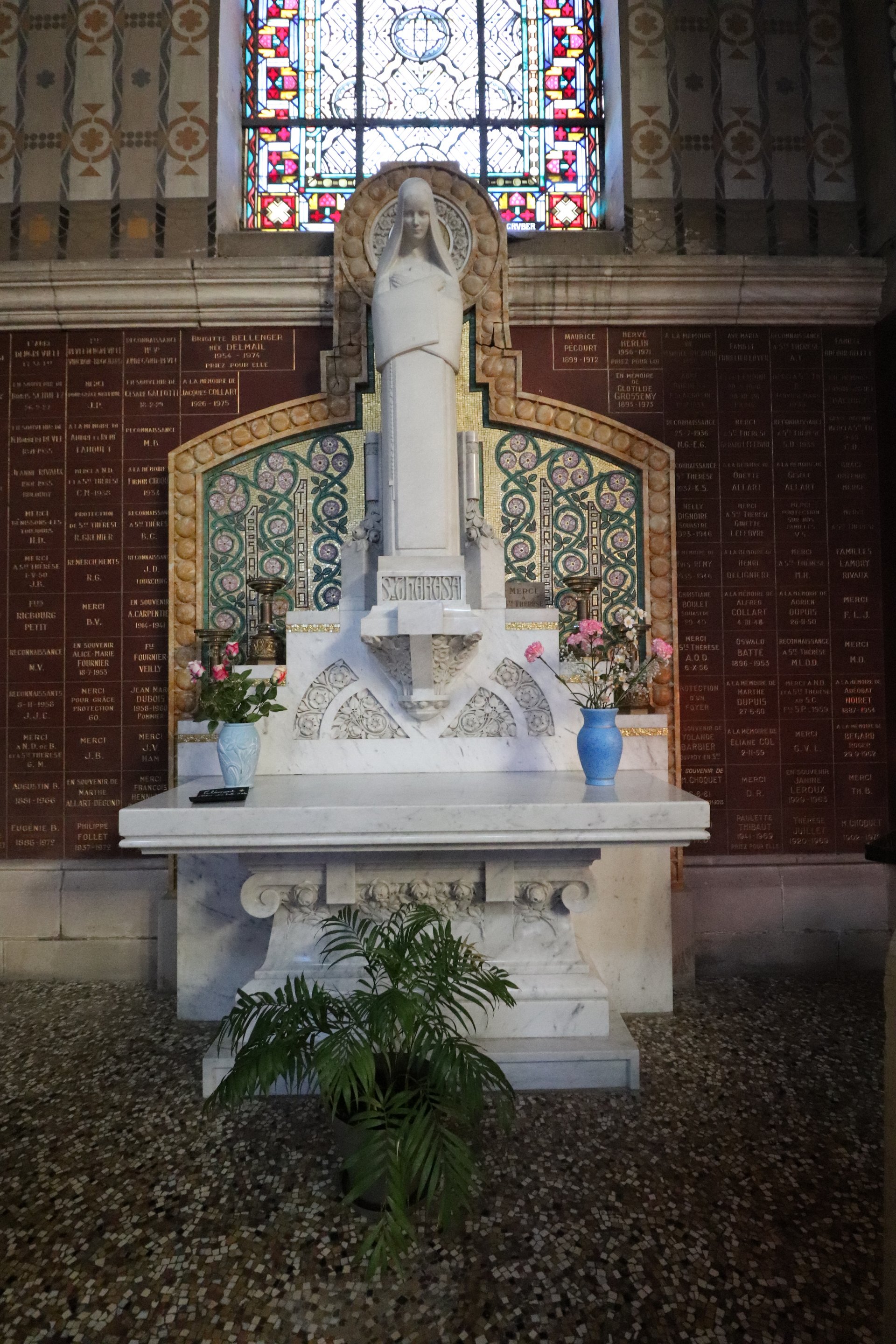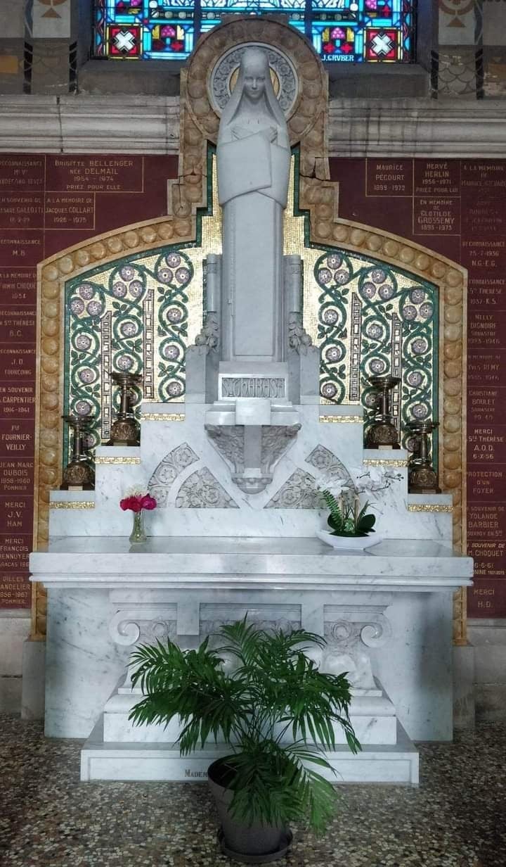 The work of sculptor Anne-Marie Roux, it faces the statue of Sainte Thérèse. It is also very Art Deco style, very refined, with geometric forms but at the same time very feminine, without her armor and with the flames in the mosaic.