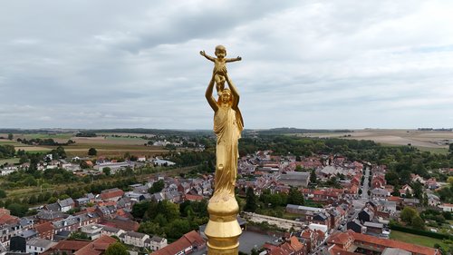 Unfortunately, the Basilica of Notre Dame de Brebières was completely destroyed during the Great War, specifically during the Battle of the Somme. On January 15, 1915, over 2,000 shells struck the building, and the Golden Virgin, leaning horizontally, became a poignant symbol of a legend. Commonwealth soldiers would whisper, "When the Virgin falls, the war will cease." Indeed, she fell on April 16, 1918, the very year the war came to an end.